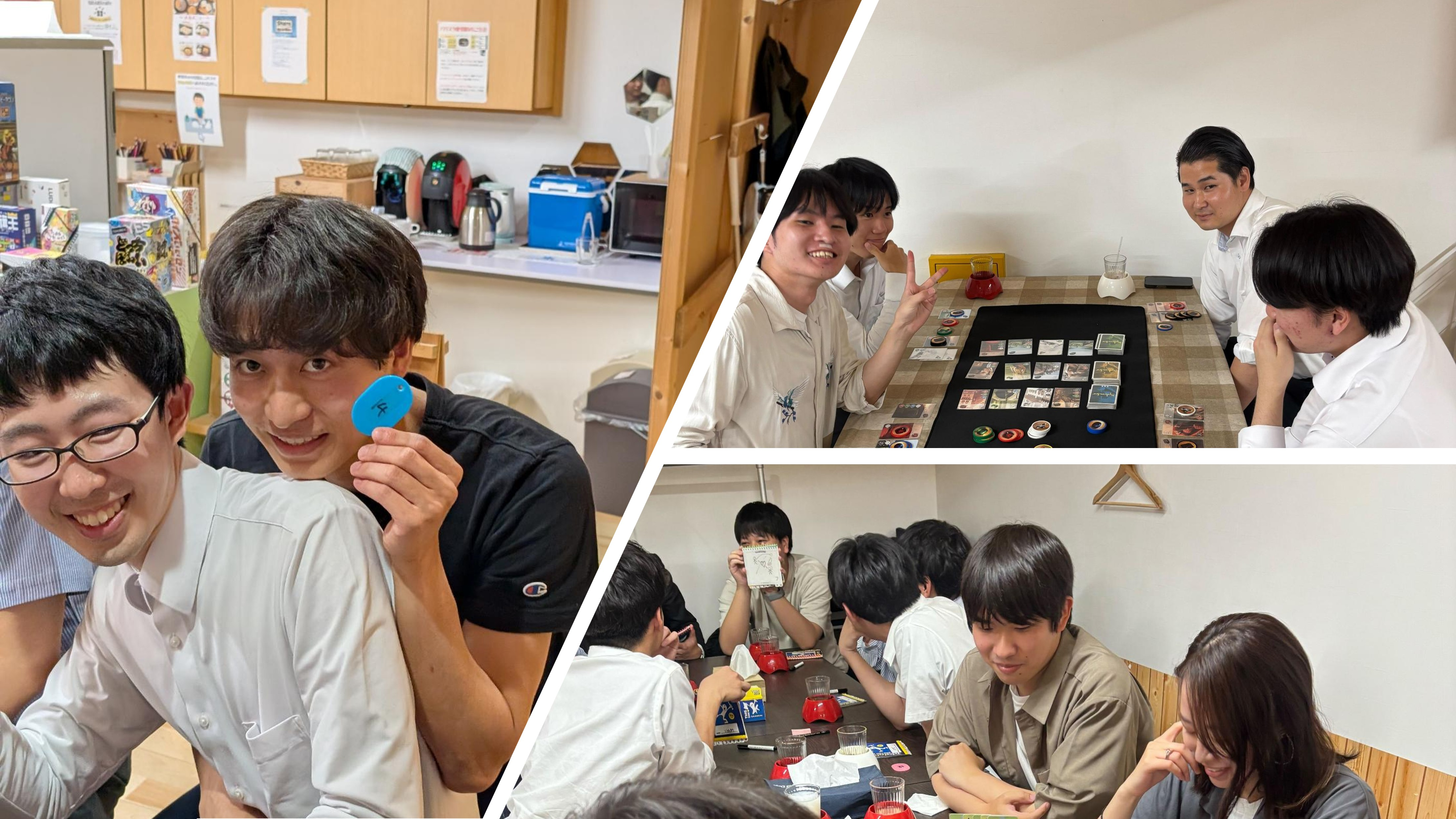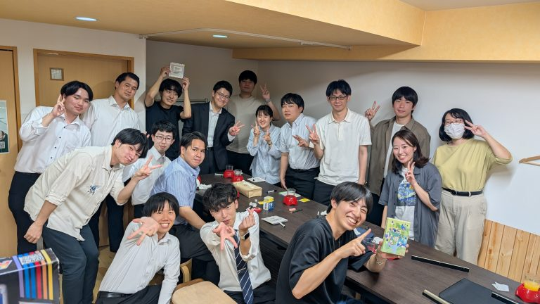 帯屋町のボードゲームカフェにて、ボードゲーム同好会のイベントを開催しました。今回は新人の方々を中心に多くの社員の皆さんにご参加いただき、3グループに分かれてさまざまなゲームを楽しみました。