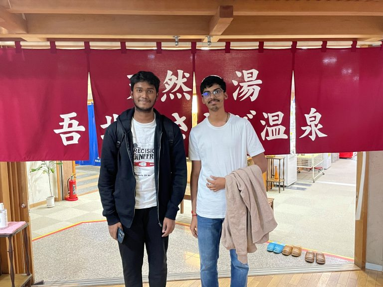にこ淵では、お二人とも写真撮影を楽しんでいました。続いて訪れたむささび温泉では、日本の共同浴場を初体験。インドでは下着のようなものを着て入浴する文化があるそうで、その違いに驚きながらも、地元の方との会話を楽しむ姿が印象的でした。
